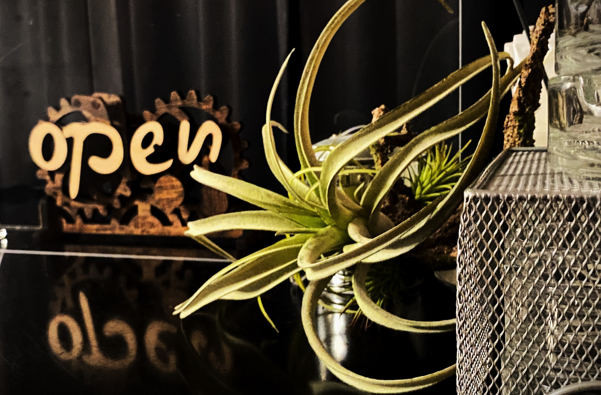 扉の格子窓から見えるこの歯車が「open」になっていれば営業中です。