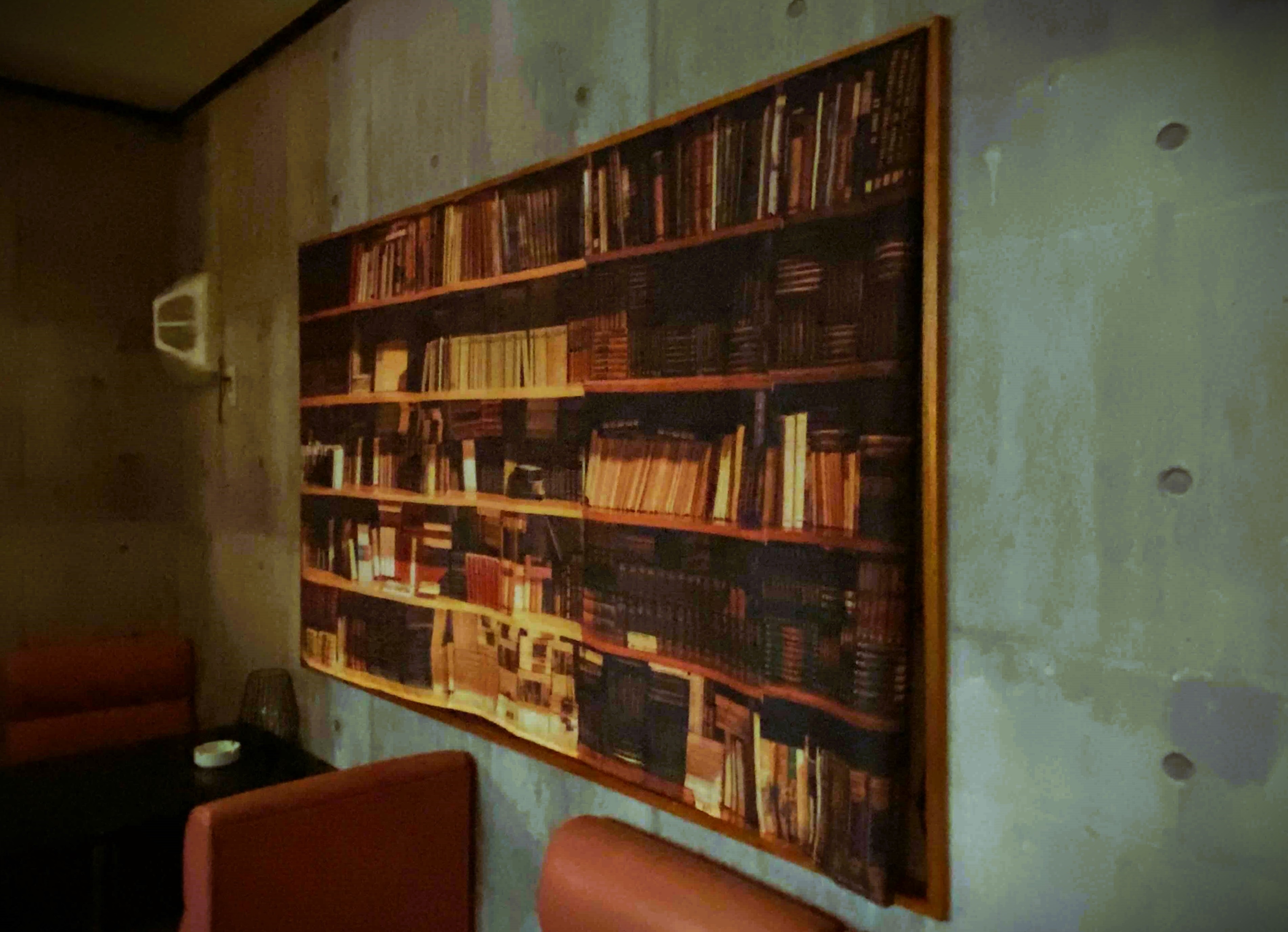 壁一面の本棚…かと思いきや騙し絵のタペストリーでした。